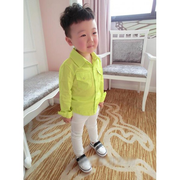 เสื้อเชิ๊ตเด็กผู้ชายออกงาน คอปกแขนยาว แต่งกระเป๋าที่อก สีเหลือง