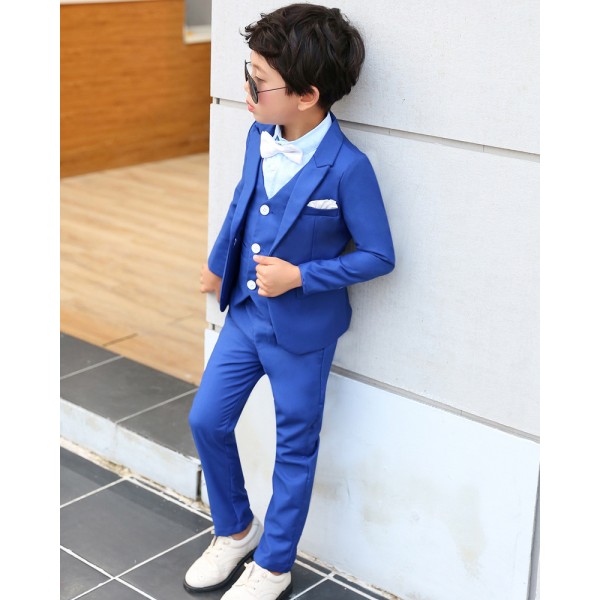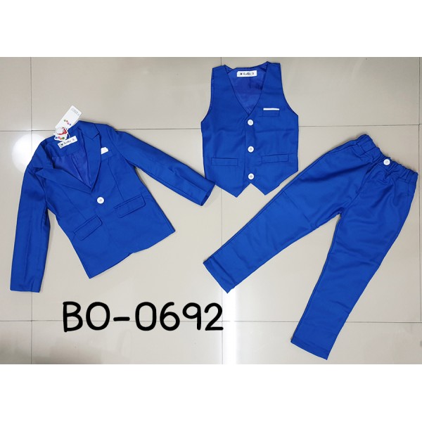 ชุดสูทเด็กผู้ชายออกงาน เสื้อคลุมสูทแขนยาว กั๊ก และกางเกงขายาว สีน้ำเงิน (3ชิ้น) (ไม่รวมเสื้อเชิ๊ตตัวใน และหูกระต่าย)