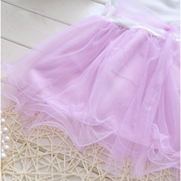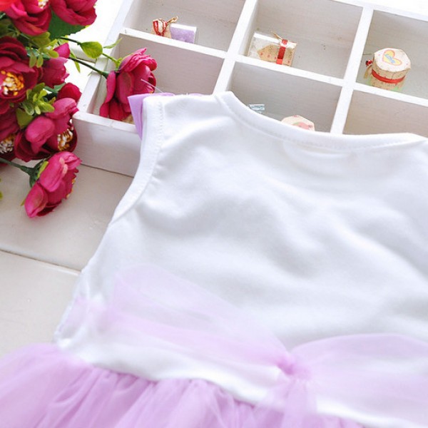 เดรสเด็กผู้หญิงออกงานแขนกุดติดโบว์ที่บ่า 2 ข้าง แต่งไข่มุกที่กระโปรงสีม่วง มีเชือกผูกโบว์ด้านหลัง
