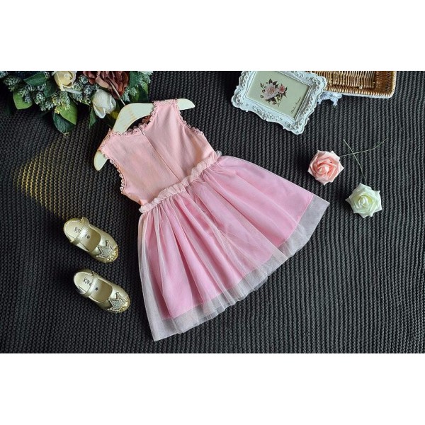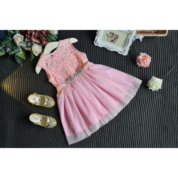 เดรสเด็กผู้หญิงออกงาน แขนกุด ผ้าลูกไม้ช่วงบน พร้อมสร้อยผูกคอ สีชมพู (2ชิ้น) ตัวสร้อยสามารถนำมาผูกคอ ผูกเอวหรือทำเป็นผ้าคาดผมก็น่ารักดีนะคะ