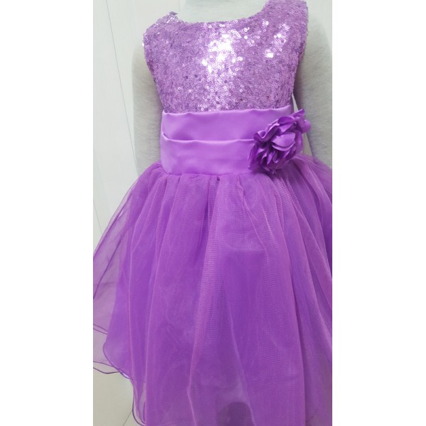 ชุดราตรีเด็กผู้หญิงใส่ออกงานแขนกุดช่วงบนปักเลื่อม แต่งดอกไม้ที่เอว สีม่วง