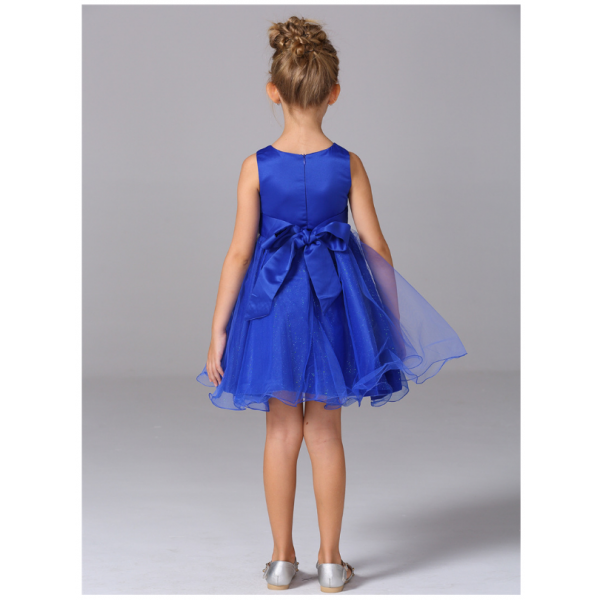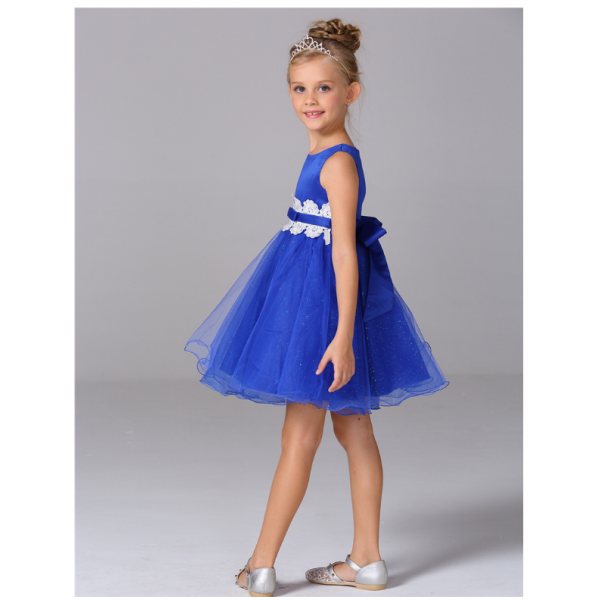 ชุดราตรีเด็กผู้หญิง ใส่ออกงาน แขนกุด แต่งลูกไม้รอบเอว คาดโบว์สีน้ำเงิน มีโบว์ผูกเอวด้านหลัง ชุดนี้งานดีนะคะมีซิปและเชือกผูกเอวด้านหลัง ด้านในกระโปรงมีผ้าซับใน 2 ชั้นซ้อนไว้ด้วยสุ่มตาข่าย หากรีดสุ่มดีๆ กระโปรงจะบานพองได้เยอะค่ะ