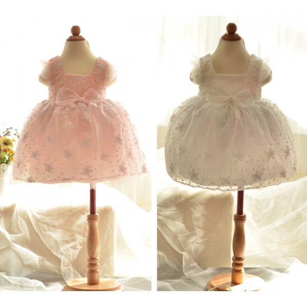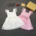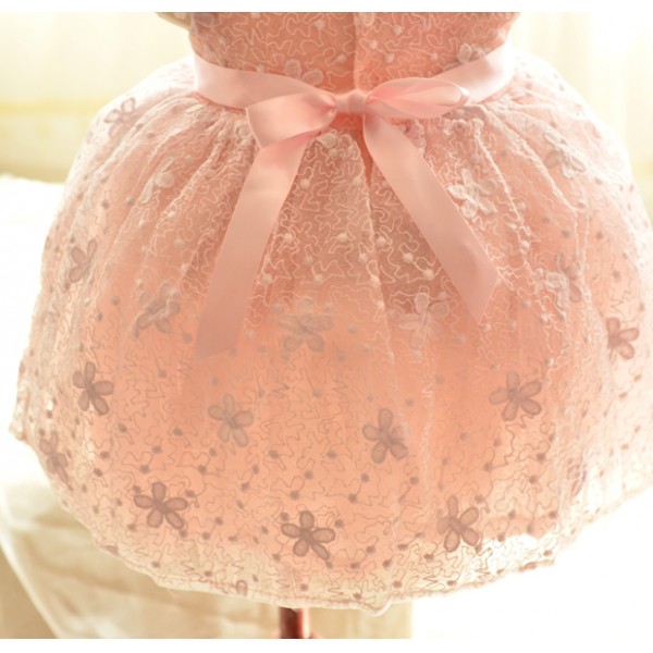 เดรสเด็กผู้หญิงแขนกุดขอบระบาย ติดโบว์ที่เอว ผ้าลูกไม้สีชมพูทั้งตัว