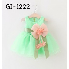 เดรสเด็กผู้หญิงออกงานแขนกุด ริบบิ้นคาดเอวสีเขียว ติดดอกไม้สีโอรส (ถอดออกได้) กระโปรงสีเขียวตองอ่อน (2ชิ้น) ซิปหลัง