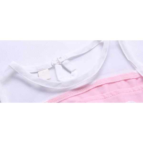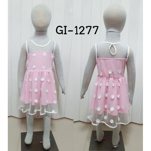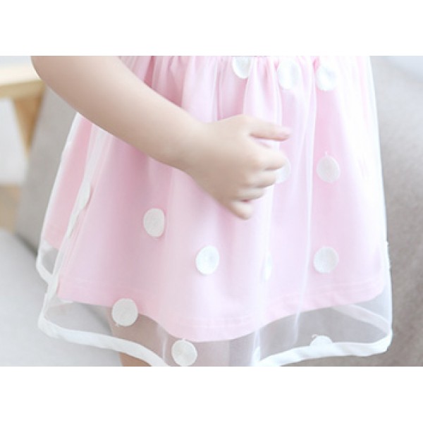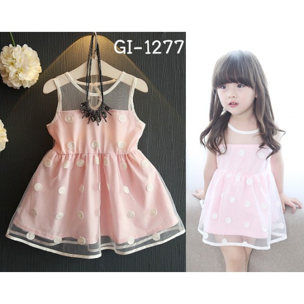เดรสเด็กผู้หญิงแขนกุด ซีทรูช่วงบน ปักวงกลมสีขาวซับในสีชมพู กระดุมคอด้านหลัง ผ้านิ่มเด้งค่ะ