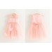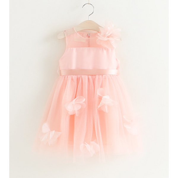 ชุดเดรสเด็กผู้หญิง แขนกุดซีทรู แต่งดอกไม้ดอกใหญ่ที่บ่าและกระโปรง สีพีช พร้อมริบบิ้นผูกเอวด้านหลัง (ถอดออกได้) (2ชิ้น) ผ้าชีฟองนิ่ม