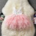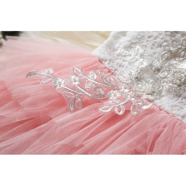 ชุดเดรสเด็กผู้หญิง แขนกุดทูโทน ช่วงบนสีขาวแต่งลูกไม้และไข่มุก ช่วงล่างกระโปรงผ้าชีฟองจับจีบเป็นชั้นๆ สีขาวโอรส มีซับในอย่างดี