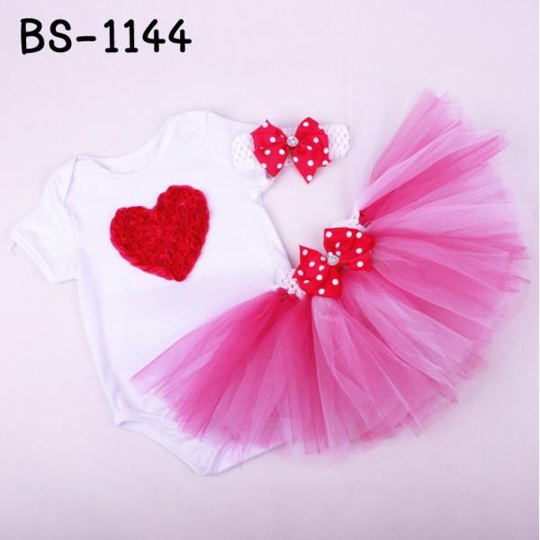 ชุดบอดี้สูทแฟนซี เด็กผู้หญิงครบเซ็ท ลายหัวใจ + ผ้าคาดผม + กระโปรงฟูฟู สีขาวสลับสีชมพูบานเย็น (3ชิ้น)