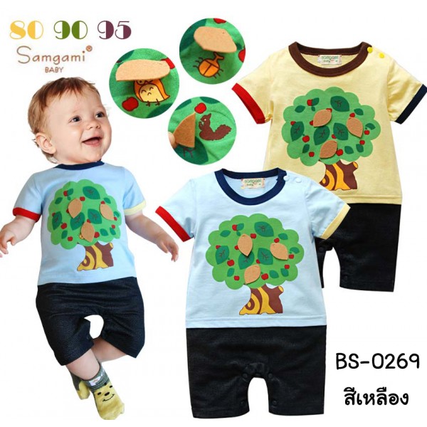 bs0269 ชุดบอดี้สูทเด็กคอกลมแขนสั้น สกรีนลายต้นไม้ ขอบแขน 2 สี สีเหลือง