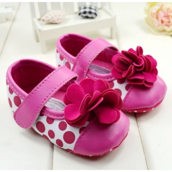 รองเท้าหัดเดินเด็กเล็ก Pre-Walker สายคาดลายจุดใหญ่ ติดดอกไม้ดอกโต สีชมพู