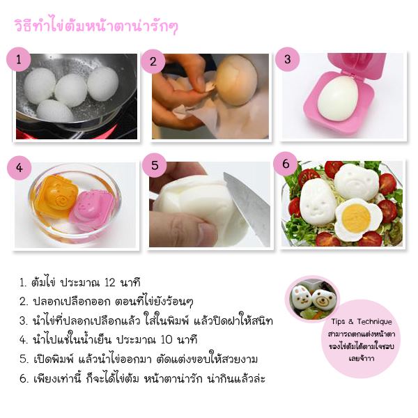 เมื่อต้มไข้และแกะเปลือก (ในขณะที่ไข่ยังอุ่นอยู่) เสร็จเรียบร้อยแล้ว นำไข่ต้มที่ได้ใส่ลงไปในบล๊อค หรือแม่พิมพ์ที่เตรียมไว้ รอจนไข่ต้มคลายความร้อนแล้วจึงนำออกมาจากแม่พิมพ์ หรือจะนำเข้าตู้เย็น หรือแช่น้ำแข็งก็ได้ค่ะ