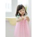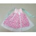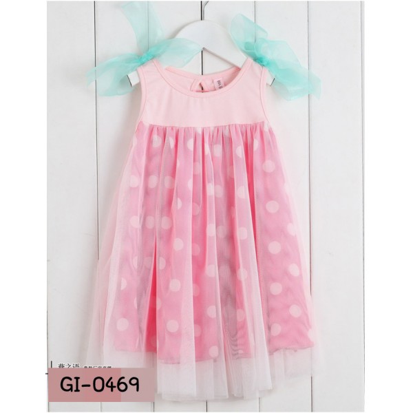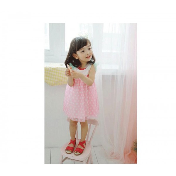 เดรสเด็กผู้หญิง แขนกุด แต่งโบว์ที่ไหล่สีเขียวทั้ง 2 ด้าน กระโปรงลายจุด สีชมพู