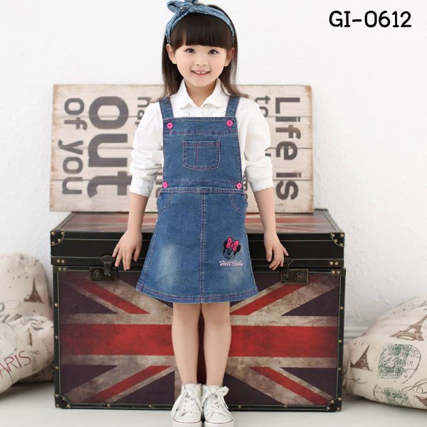 เดรสเอี๊ยมยีนส์ เด็กผู้หญิง แต่งกระเป๋าที่อก ปักหน้ามินนี่ เม้าส์ สียีนส์ ปรับกระดุมได้ 2 ระดับ (ไม่รวมเสื้อตัวใน)