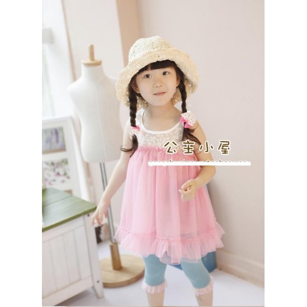 เดรสสั้นเด็กผู้หญิง ออกงาน แขนกุดช่วงบนผ้าลูกไม้โปร่ง ช่วงล่างผ้าชีฟอง สีชมพู (ไม่รวมเล็คกิ้ง)