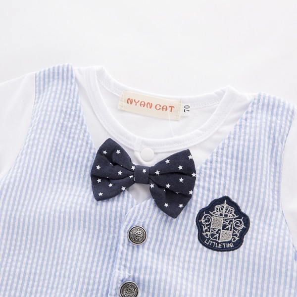 ชุดบอดี้สูทเด็กผู้ชายออกงานแขนสั้น ติดหูกระต่ายลายดาว กั๊กเย็บติดลายทางสีฟ้า กางเกงสีกรมท่า