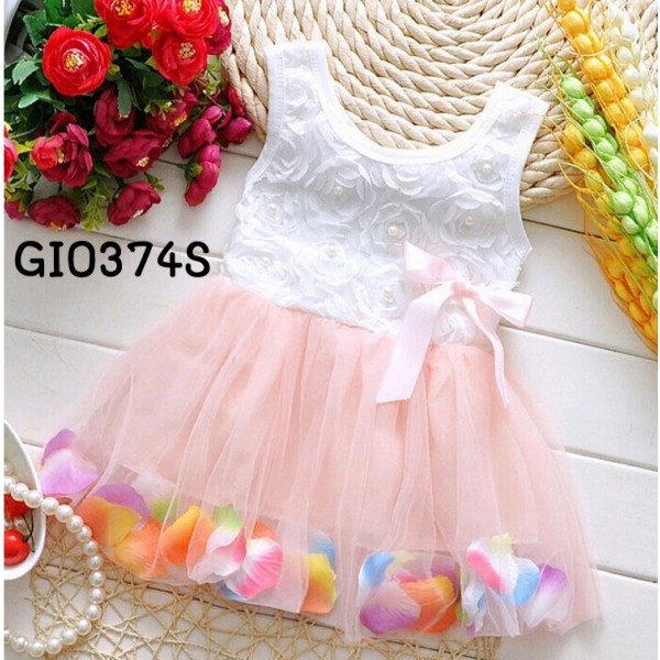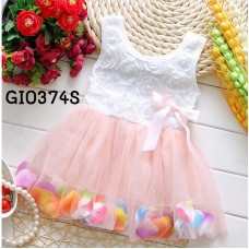 เดรสเด็กผู้หญิงออกงาน แขนกุดแต่งหัวใจที่อก แต่งลูกไม้ทรงกุหลาบเกสรไข่มุก และ กลีบกุหลาบหลากสีในกระโปรง สีชมพู