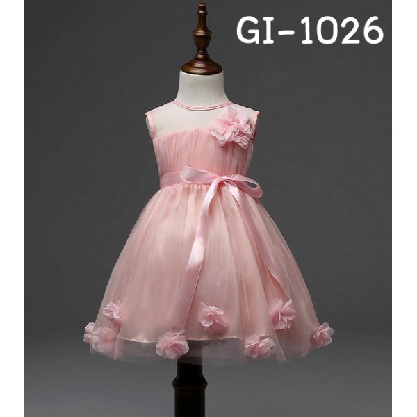 ชุดราตรีเด็กผู้หญิงออกงาน แขนกุดซีทรูช่วงบน โบว์ผูกเอว แต่งดอกไม้ สีโอรส ผ้าชีฟองนิ่ม