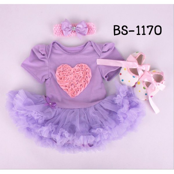 ชุดบอดี้สูทแฟนซี เด็กผู้หญิงครบเซ็ท ลายหัวใจ สีม่วง+ ผ้าคาดผม + รองเท้า (3ชิ้น)