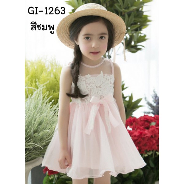 GI1263X << สินค้ามีตำหนิ >> ชุดเดรสเด็กผู้หญิงออกงาน แขนกุด แต่งไข่มุกและลูกไม้ช่วงบน ติดโบว์ สีชมพู