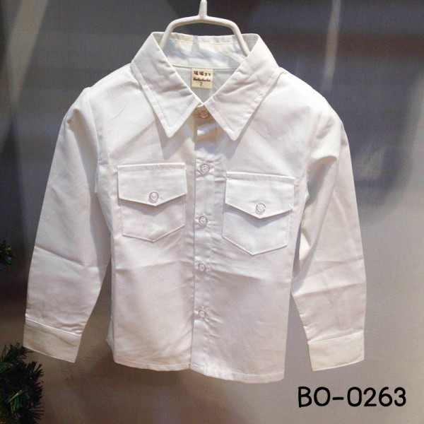 BO0263X << สินค้ามีตำหนิ >> เสื้อเชิ๊ตเด็กผู้ชายออกงาน คอปกแขนยาว แต่งกระเป๋าที่อก สีขาว