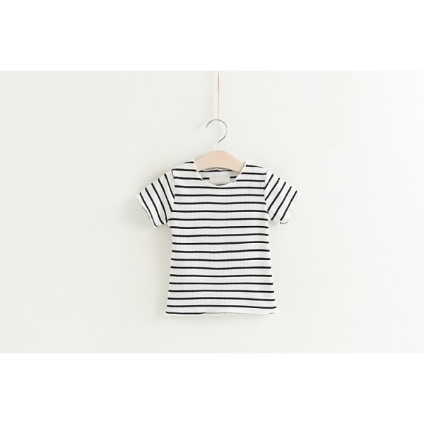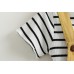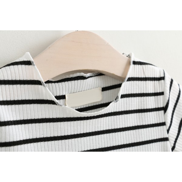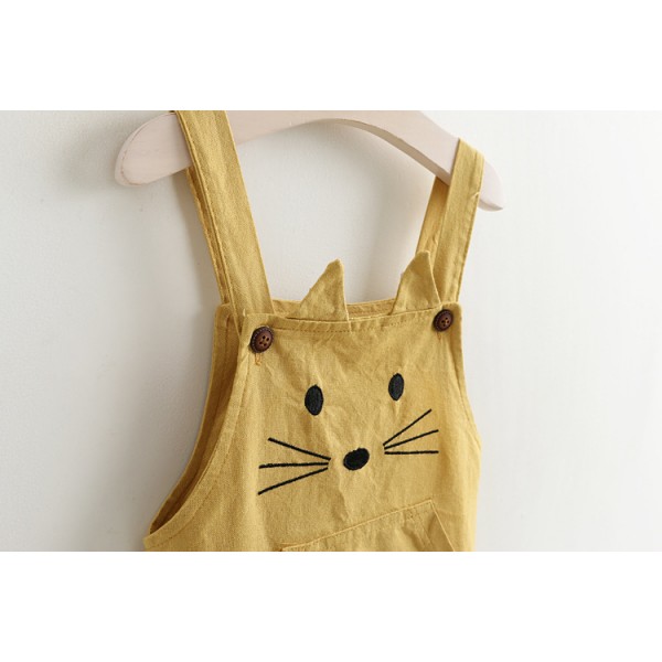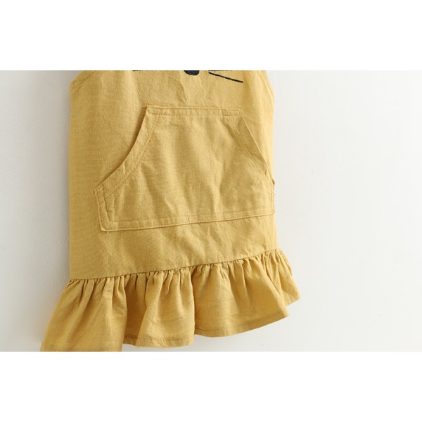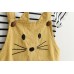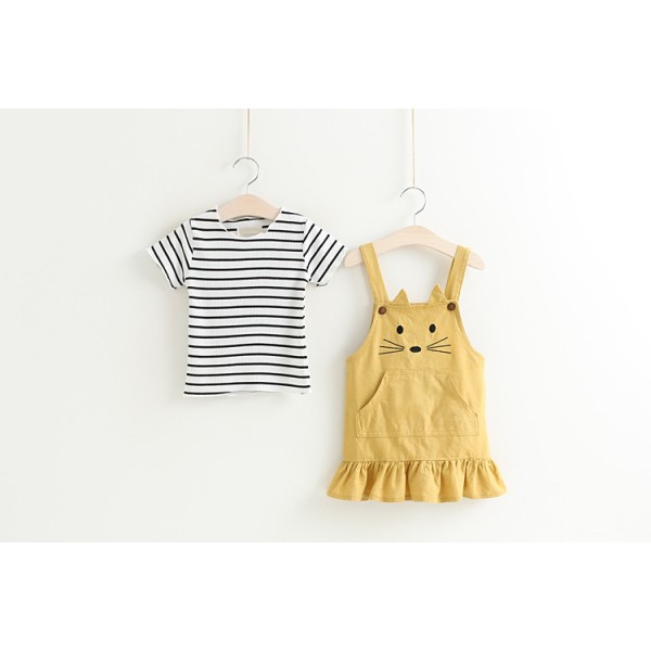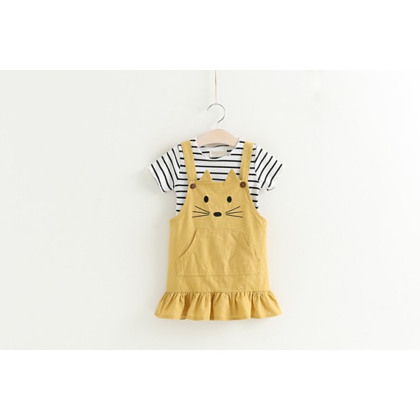 ชุดเอี๊ยมเด็กผู้หญิง เสื้อแขนสั้นลายขวาง และเอี๊ยมกระโปรงหน้าแมว สีเหลืองคัสตาร์ด (2ชิ้น)