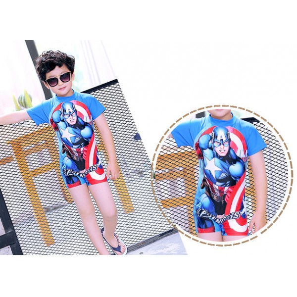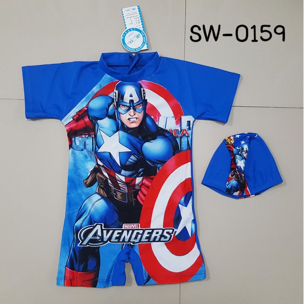 ชุดว่ายน้ำเด็กผู้ชาย แบบบอดี้สูท ลายซุปเปอร์ฮีโร่ กัปตันอเมริกา พร้อมหมวก (2ชิ้น) Captain America มีซิปด้านหลังค่ะ