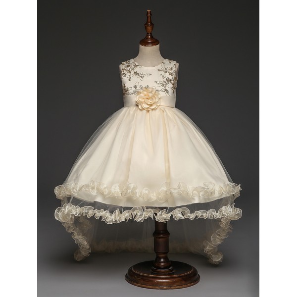 ชุดราตรีเด็กโต แขนกุดปักเลื่อมสีทอง ติดดอกไม้ที่เอว (เข็มกลัดถอดออกได้) ชายกระโปรงหน้าสั้นหลังยาว