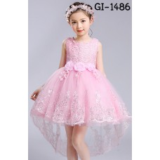 ชุดเดรสราตรีเด็กผู้หญิงสุดหรู แขนกุดช่วงบนอกผ้าลูกไม้ ติดดอกไม้ 3 ดอก (เข็มกลัดถอดออกได้) กระโปรงปักเลื่อมหน้าสั้นหางยาว สีชมพู ด้านหลังติดโบว์ใหญ่ (เข็มกลัดถอดออกได้) ซิปหลังซ่อน ด้านในกระโปรงมีผ้าซับใน 2 ชั้นซ้อนไว้ด้วยสุ่มตาข่าย หากรีดสุ่มดีๆ กระโปรงจะบานพองได้เยอะค่ะ