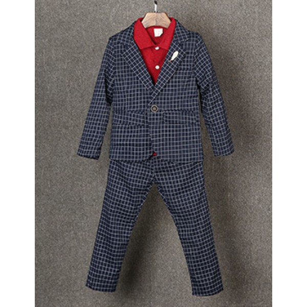 ชุดสูทเด็กผู้ชายออกงาน เสื้อคลุมสูทแขนยาว และกางเกงขายาว ลายตารางสีกรมท่า (2ชิ้น) (ไม่รวมเสื้อสีแดงตัวใน และเข็มกลัดติดปกเสื้อ)