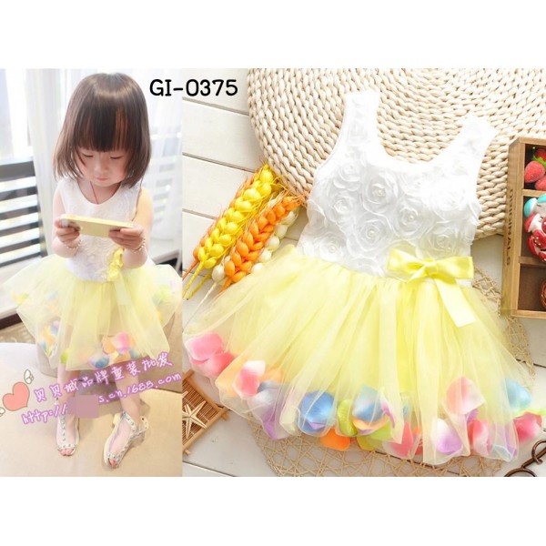 เดรสเด็กผู้หญิงออกงาน แขนกุดแต่งลูกไม้ทรงกุหลาบเกสรไข่มุก และ กลีบกุหลาบหลากสีในกระโปรง สีเหลือง