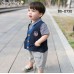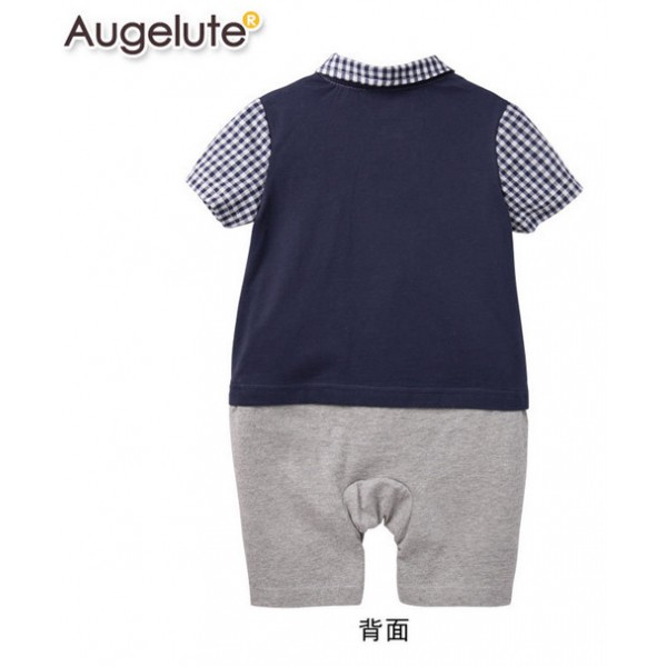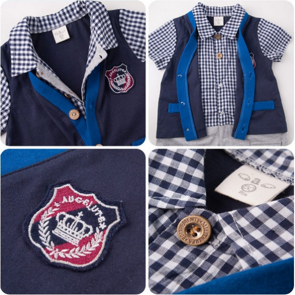 ชุดบอดี้สูทเด็กผู้ชายคอปกลายตารางขาวน้ำเงิน กางเกงสีเทา แต่งกระเป๋าที่ขากางเกง เสื้อกั๊กสีกรมท่าขอบน้ำเงิน